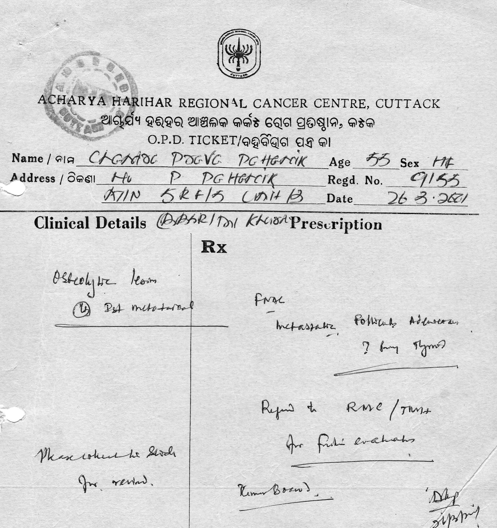 ଟାଟା ମେମୋରିଆଲର ପ୍ରଚଳିତ ବ୍ୟବସ୍ଥା ଅନୁଯାୟୀ ଜଣେ ରୋଗୀଙ୍କ ସହ ଏକାଧିକ ସଂପର୍କିୟ ନଥିଲେ ସେଠାରେ ଚିକିତ୍ସିତ ହେବା ଏକ ପ୍ରକାର ଅସମ୍ଭବ ହୋଇପଡ଼ିଥାଏ । କାରଣ ଆଉଟ ପେସେଣ୍ଟ ଡ଼ିପାର୍ଟମେଣ୍ଟ ପାଇଁ ନାମ ପଞ୍ଜିକରଣ କରିବା ସହ ବିଭିନ୍ନ ପରୀକ୍ଷା ନିରୀକ୍ଷା ପାଇଁ ଆବଶ୍ୟକୀୟ ଅର୍ଥ ଜମା କରିବା ନିମନ୍ତେ ପ୍ରତିଟି କାଉଂଟରରେ ଲମ୍ବା ଧାଡ଼ିରେ ଠିଆ ହେବାକୁ ପଡ଼ିଥାଏ । ସେତେବେଳକୁ ମୁଁ ପାର୍ଥ ଅମରଜିତ ଓ ଶଶିଅପାଙ୍କ ସହିତ ସୁରେନ୍ଦ୍ର ମହାପାତ୍ର ମଧ୍ୟ ଆମ ସହ ଯୋଡ଼ି ହୋଇଯାଇଥିଲେ । ତେଣୁ ବିଭିନ୍ନ କାଉଂଟରରେ ଆବଶ୍ୟକୀୟ ଅର୍ଥ ଜମାଦେବା ଏବଂ ରକ୍ତ ଓ ଅନ୍ୟାନ୍ୟ ନମୁନା ସଂଗ୍ରହ କରିବା ଦିଗରେ ବିଶେଷ କିଛି ଅସୁବିଧା ହେଉନଥାଏ ।