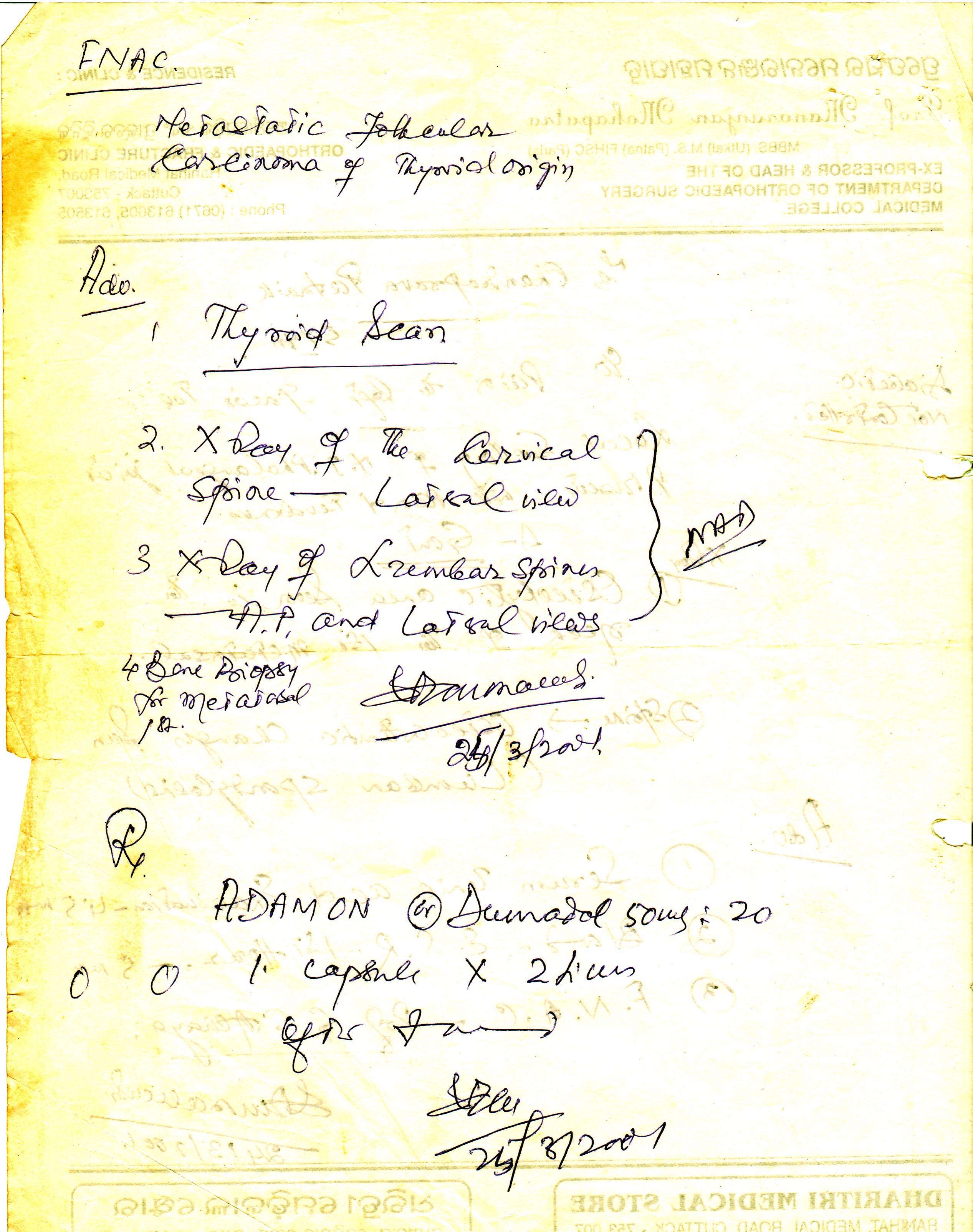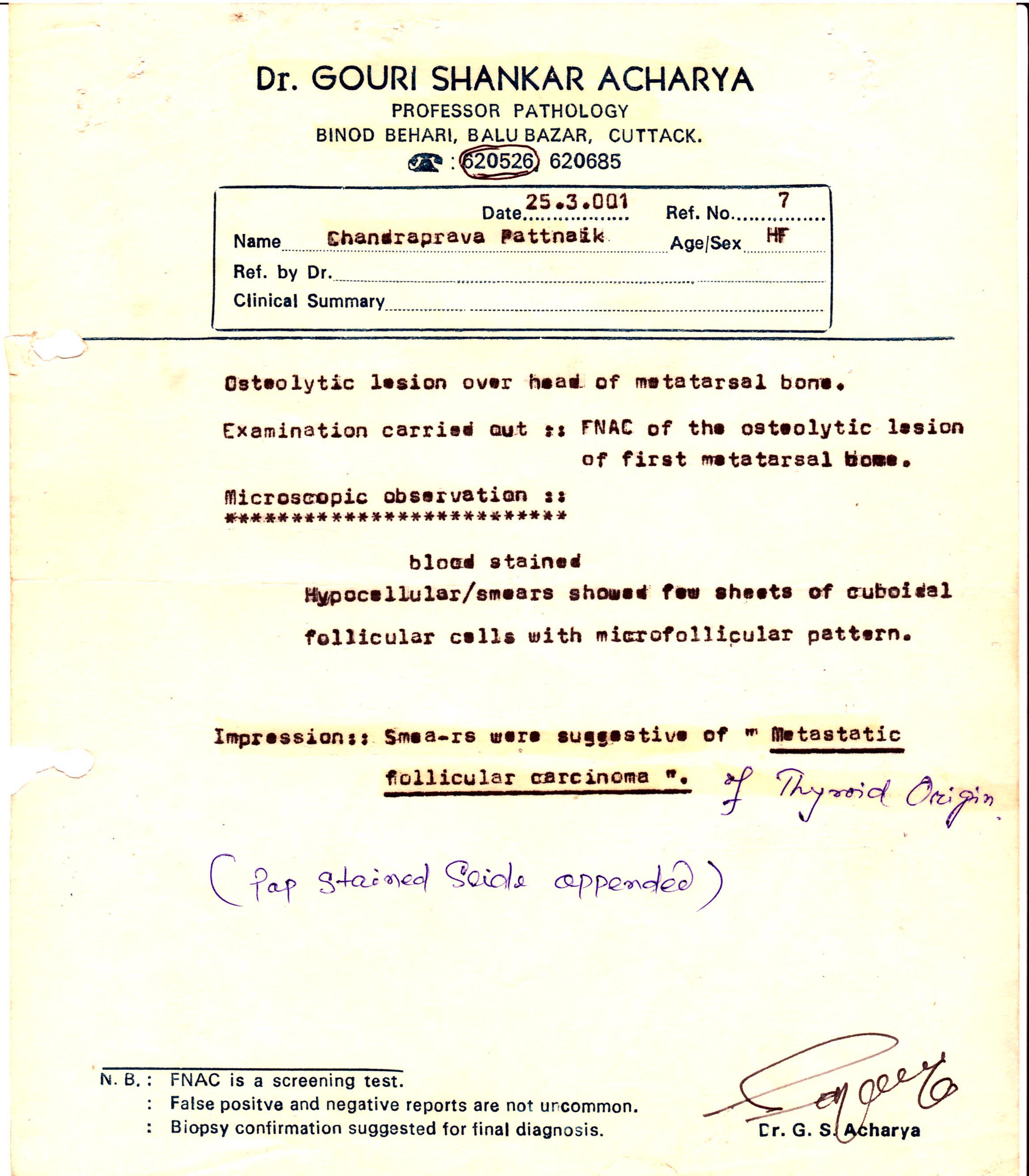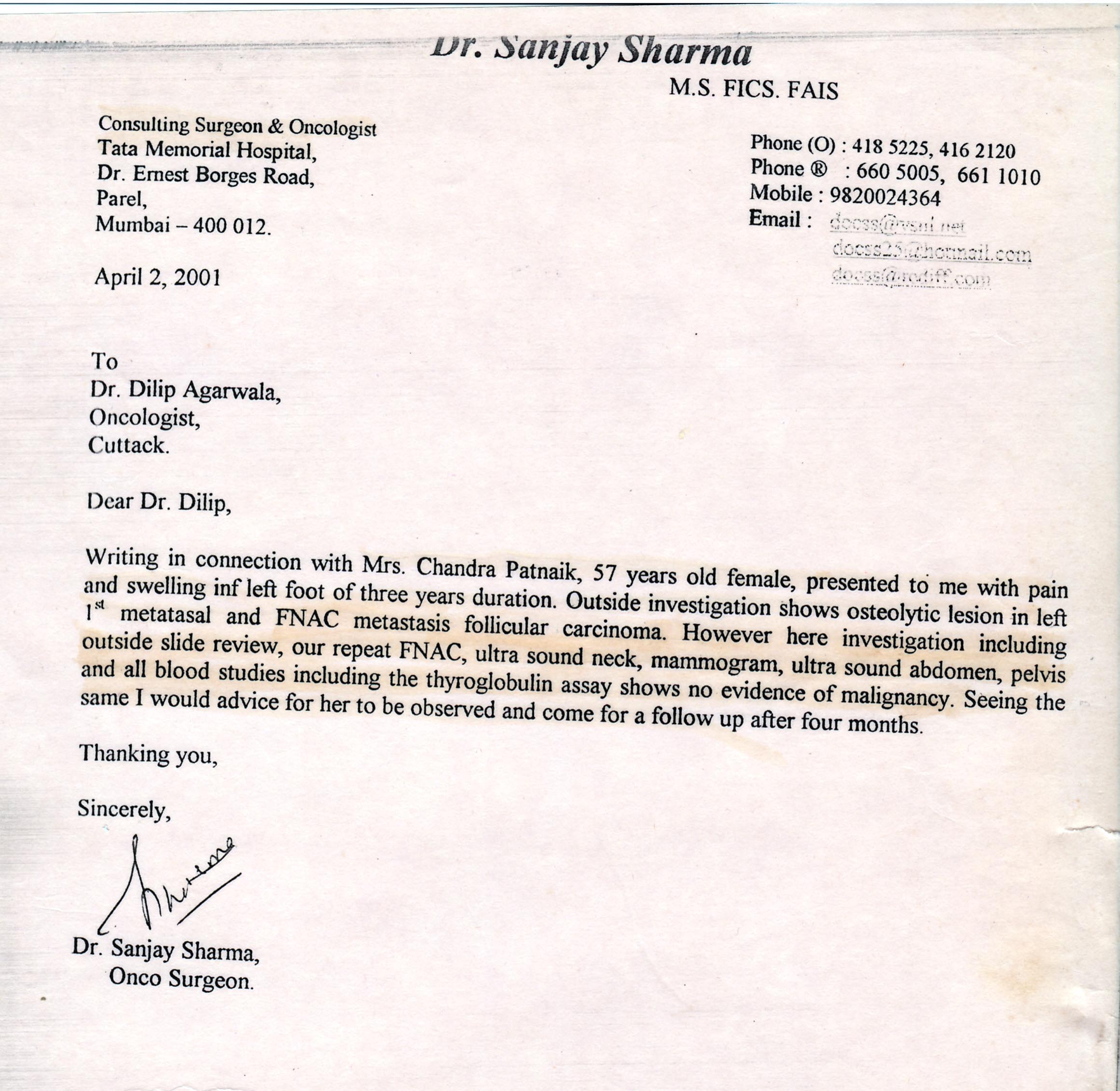Writing in connection with mrs.chandra patnaik, 57 years old female, presented to me with pain and swelling inf lwft foot of three yreas duration. Outside investigation shows osteolytic lesion in left 1st metatasal and FNAC metastasis follicukar carcinoma. However here investigation including outside slide review, our repeat FNAC, ultra sound neck, mammogram, ultra sound abdomen, pelvis and all blood studies including the thyroglobulin assay shows on evidence of malignancy. Seeing the same i would advice for her to be observed and come for a follow up after four months.