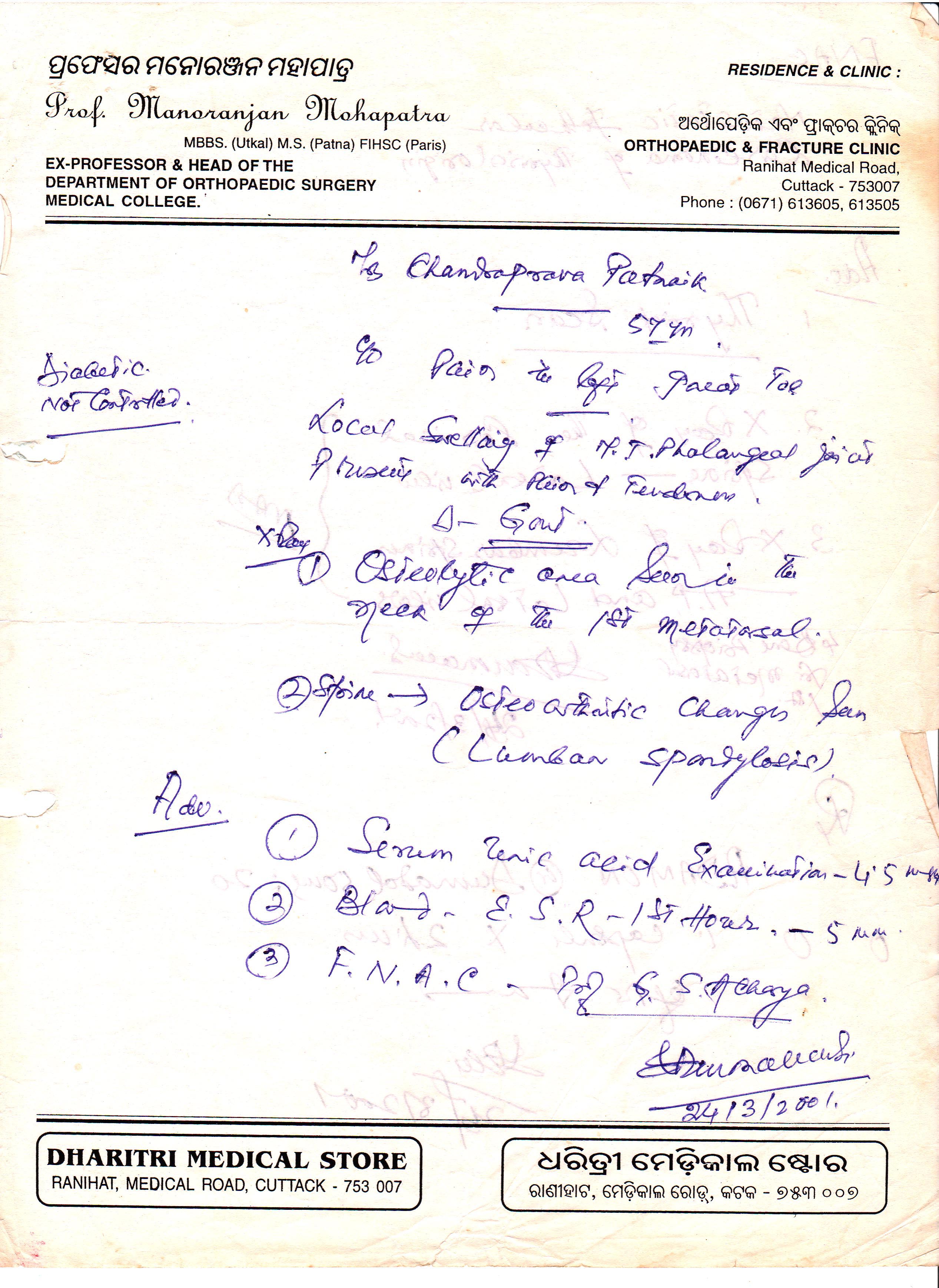 ଇତି ମଧ୍ୟରେ ୨୦୦୧ ମସିହା ମାର୍ଚ୍ଚ ଶେଷ ସପ୍ତାହରେ ଚନ୍ଦ୍ରପ୍ରଭା ତାଙ୍କ ବାମ ଗୋଡ଼ର ବୁଢ଼ା ଆଙ୍ଗୁଳି ସଲଗ୍ନ କିଛି ଅଂଶରେ ପ୍ରଚଣ୍ଡ ଯନ୍ତ୍ରଣା ଅନୁଭବ କରିବା ଆରମ୍ଭ କରିବାରୁ ତାଙ୍କର ଚିକିତ୍ସା ପାଇଁ ସମସ୍ତେ ବ୍ୟସ୍ତ ହୋଇ ପଡ଼ିଥିଲେ । ମୋର ଦେଢ଼ଶାଶୁ ଡ଼ାକ୍ତର ଶଶୀଙ୍କ ଦ୍ୱିତୀୟ ପୁଅ ଡ଼ାକ୍ତର ଅମର ଜିତ ମହାନ୍ତି (ଜୁବୁଲି) ଅର୍ଥପେଡ଼ିସ୍କରେ ବିଶେଷଜ୍ଞ ଥିବାରୁ ତାର ପରାମର୍ଶ ମଧ୍ୟ ନେଇଥିଲୁ । ସେ କଟକ ଶ୍ରୀ ରାମଚନ୍ଦ୍ର ଭଞ୍ଜ ମେଡ଼ିକାଲ କଲେଜର ଜଣାଶୁଣା ବିଶେଷଜ୍ଞ ପ୍ରଫେସର ମନୋରଞ୍ଜନ ମହାପାତ୍ରଙ୍କ ମତାମତ ନେବାପାଇଁ ପରାମର୍ଶ ଦେଇଥିଲା । ତଦନୁଯାୟୀ ଚନ୍ଦ୍ରପ୍ରଭାଙ୍କୁ ନେଇଁ ବଡ଼ପୁଅ ପାର୍ଥ ଓ ମୁଁ ଡକ୍ଟର ମହାପାତ୍ରଙ୍କୁ ଦେଖାଇଥିଲୁ । ସେ ତାଙ୍କର ବିିଭିନ୍ନ ପ୍ରକାର ପରୀକ୍ଷାର ରିପୋର୍ଟ ଦେଖି ସିରମ୍ ୟୁରିକ୍ ଏସିଡ୍ ରକ୍ତର ଇ.ଏସ୍‌.ଆର ଏବଂ ଯନ୍ତ୍ରଣା ହେଉଥିବା ଆଙ୍ଗୁଠିରୁ ଛୁଞ୍ଚିରେ ସାମ୍ପୁଲ ନେଇ ଏଫ୍‌.ଏନ୍‌.ଏ.ସି କରିବା ନିମନ୍ତେ ୨୪.୦୩ ରେ ପରାମର୍ଶ ଦେଇଥିଲେ । ନିର୍ଦ୍ଧିଷ୍ଟ ଭାବରେ କଟକର ପ୍ରଖ୍ୟାତ୍ ନିଦାନ ବିଶେଷଜ୍ଞ ଡକ୍ଟର ଗୌରିଶଙ୍କର ଆଚାର୍ଯ୍ୟଙ୍କ ଦ୍ୱାରା ଏହି ପରୀକ୍ଷାଟି କରାଇବା ପାଇଁ ପରାମର୍ଶ ଦେଇଥିଲେ । ଡ.ମହାପାତ୍ରଙ୍କ ପରାମର୍ଶ କ୍ରମେ ଡ. ଆଚାର୍ଯ୍ୟଙ୍କ ବାଲୁବଜାର ଠାରେ ଥିବା ପରୀକ୍ଷା ଗାରାରେ ରକ୍ତର ନମୁନା ସେ ସଂଗ୍ରହ କରିଥିଲେ । ତା’ପର ଦିନ ରିପୋର୍ଟ ଦେବା ପାଇଁ ସେ ପ୍ରତିଶ୍ରୁତି ଦେଇଥିବାରୁ ମାର୍ଚ୍ଚ ୨୫ ତାରିଖ ଦିନ ଚନ୍ଦ୍ରପ୍ରଭା, ମୁଁ ଓ ବଡ଼ ପୁଅ ପାର୍ଥ ଡ଼. ଆଚାର୍ଯ୍ୟଙ୍କୁ ଦେଖାକରି ରିପୋର୍ଟଟି ସଂଗ୍ରହ କରିଥିଲୁ । ଏହି ରିପୋର୍ଟଟିରେ ସେ ଉଲ୍ଲେଖ କରିଥିଲେ ‘smears were suggestive of metastatic follicular carcinoma of thyroid origin’ ଅର୍ଥାତ ଥାଇରଡ଼ ସୁତ୍ରରୁ ଆରମ୍ଭ ହୋଇଥିବା କର୍କଟ ରୋଗ । ରିପୋର୍ଟଟି ଦେଖିବା ପରେ ଏହାର ଉପସମ ପାଇଁ ଶଲ୍ୟ ଚିକିତ୍ସା ଅଥବା କେମୋ ଥେରାପି ଆବଶ୍ୟକ ହେବ ବୋଲି ମୁଁ ବ୍ୟଥିତ ହୋଇ ଡ଼. ଆଚାର୍ଯ୍ୟଙ୍କୁ ପ୍ରଶ୍ନ କରିବାରୁ ସେ କହିଥିଲେ ଯେ, ଗଳାରୁ ଆରମ୍ଭ ହୋଇ ପାଦର ବୁଢ଼ା ଆଙ୍ଗୁଳି ପର୍ଯ୍ୟନ୍ତ ବ୍ୟାପି ଯାଇଥିବା କ୍ୟାନ୍ସର ପାଇଁ କେଉଁଠାରେ ଅସ୍ତ୍ରପୋଚାର କରିହେବ ତାଛଡ଼ା ଏହିଭଳି ପରିସ୍ଥିତିରେ କେମୋ ଥେରାପି କେତେଦୂର ସହାୟକ ହେବ ତାହା କେବଳ କର୍କଟ ରୋଗ ବିଶେଷଜ୍ଞ ହିଁ କହିପାରିବେ ।